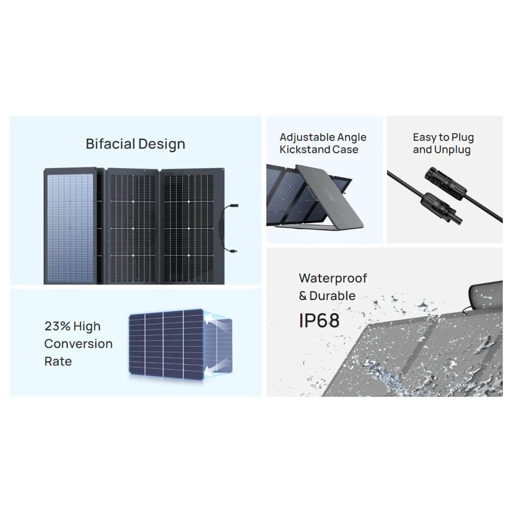• Преносимият соларен панел 220W Bifacial на EcoFlow е две в едно. С 220W основната си страна и 155W от задният край за околна светлина, можете да уловите до 25% повече слънчева енергия и да заредите преносимата си електроцентрала още по-бързо. Опитайте с огледална повърхност и можете да получите до 80% повече енергия